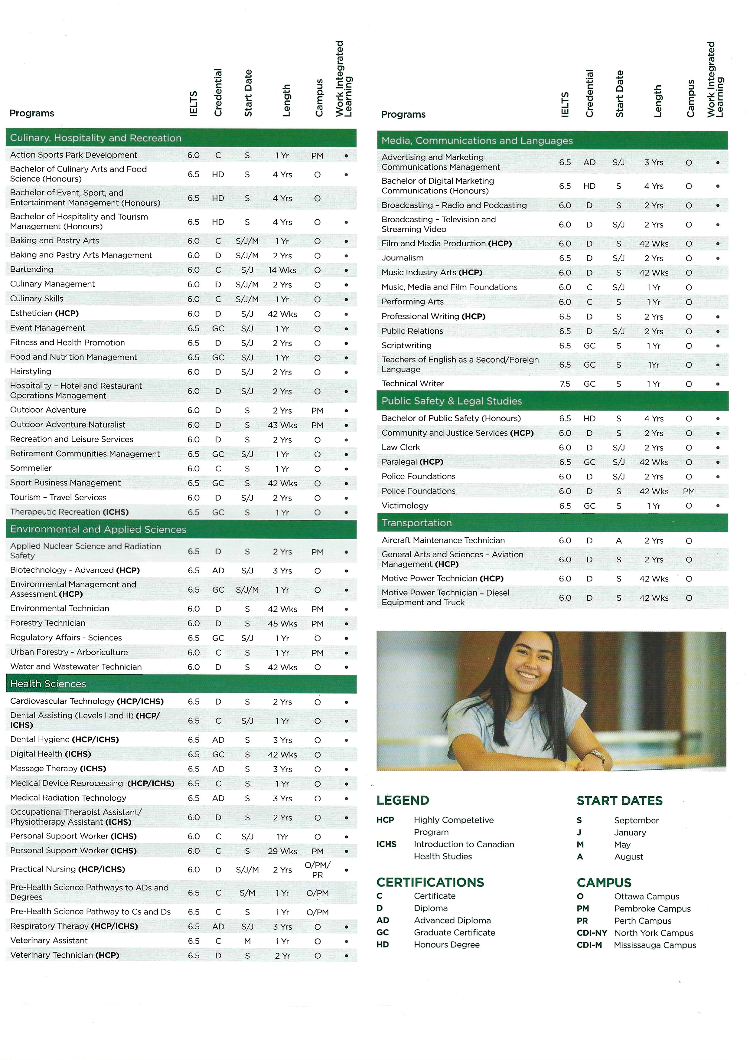 Algonquin College มีโปรแกรมให้เลือกเรียนมากกว่า 300 โปรแกรมคลอบคลุมทุกสาขาวิชาชีพ พร้อมการฝึกงานระหว่างเรียน หลังเรียนจบสามารถขอใบอนุญาตในการทำงานได้ (PGWP) ตั้งแต่ 1- 3 ปีขึ้นอยู่กับระยะเวลาที่ลงเรียน